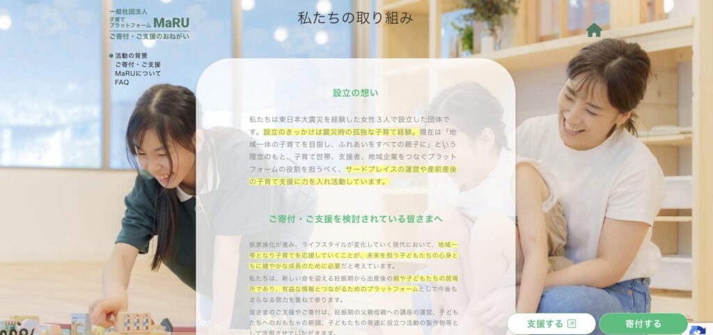 私たちはいま、子育てをしている世帯が次の支援者となり、子育てのリレーを繋いでいけるような循環的な子育て支援の仕組みを作ろうとしています。あなたに合った支援の方法で子どもと子育て世帯の未来を変えていきませんか。皆さまの想いを、子どもたちや子育て世帯の未来にMaRUが繋いで参ります。